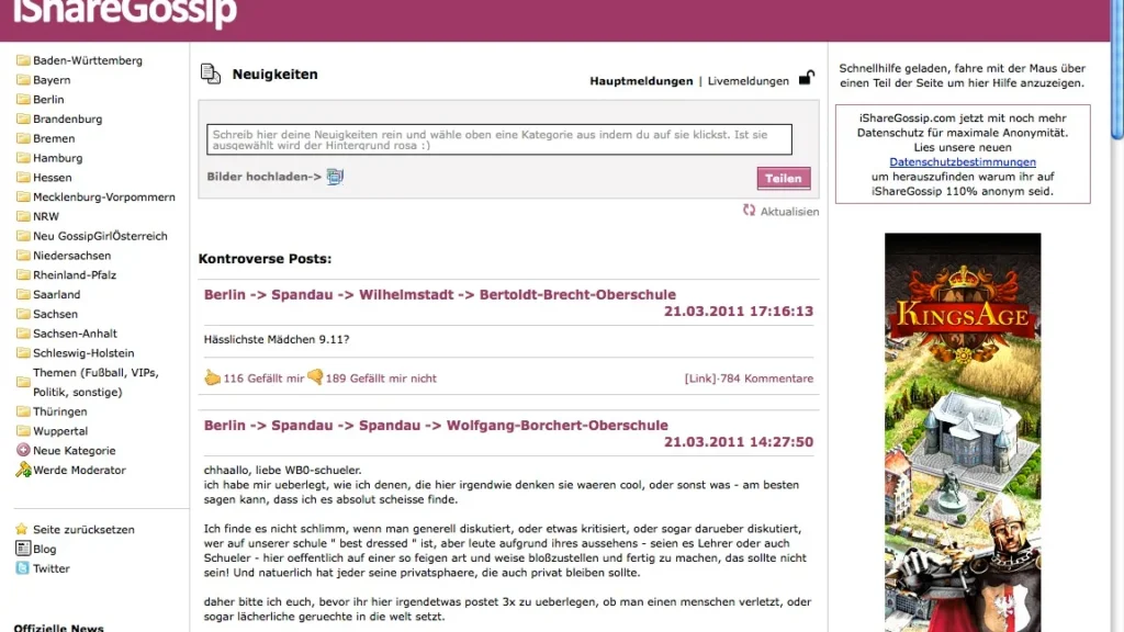Regelmäßig wurde die größte Schlampe der Klasse 10b gewählt, darüber philosophiert welcher Junge sicher schwul ist, wer hässlich ist und wer hot, wer sich am besten umbringen soll und welcher Lehrer direkt aufgehängt gehört. Alles fein und ordentlich sortiert nach Bundesland, Stadt, Schule – bis runter zur einzelnen Klasse.