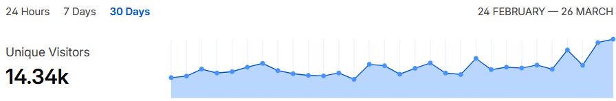 Zwar hat die Seite gegenüber ihre Hochzeit vor der Pause und dem Relaunch „nur“ noch so viele Besucher in einem Monat, wie sie früher an einem Tag hatte, aaaaber nichtsdestotrotz krüppeln sich Bot- und Crawler-bereiningt immer noch rund 14.000 Besucher pro Monat hierher.